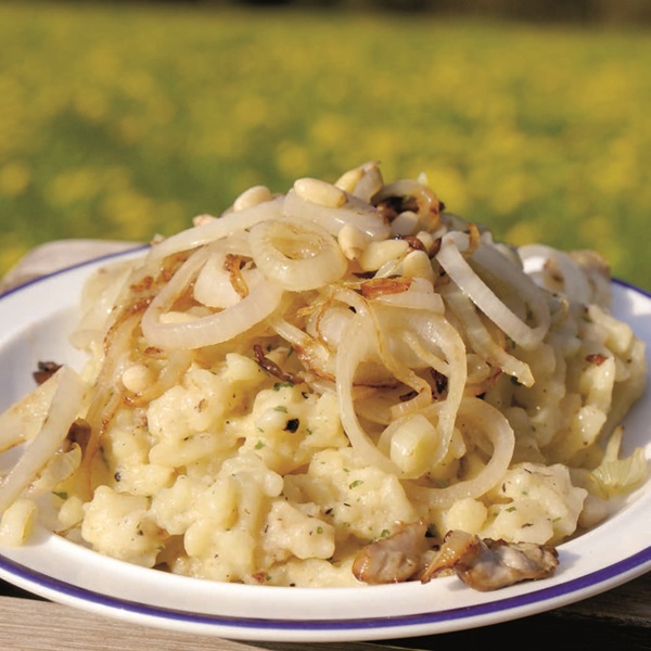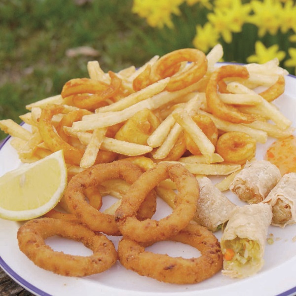 • Panierte Zwiebelringe & Frühlingsrollen mit Pommes